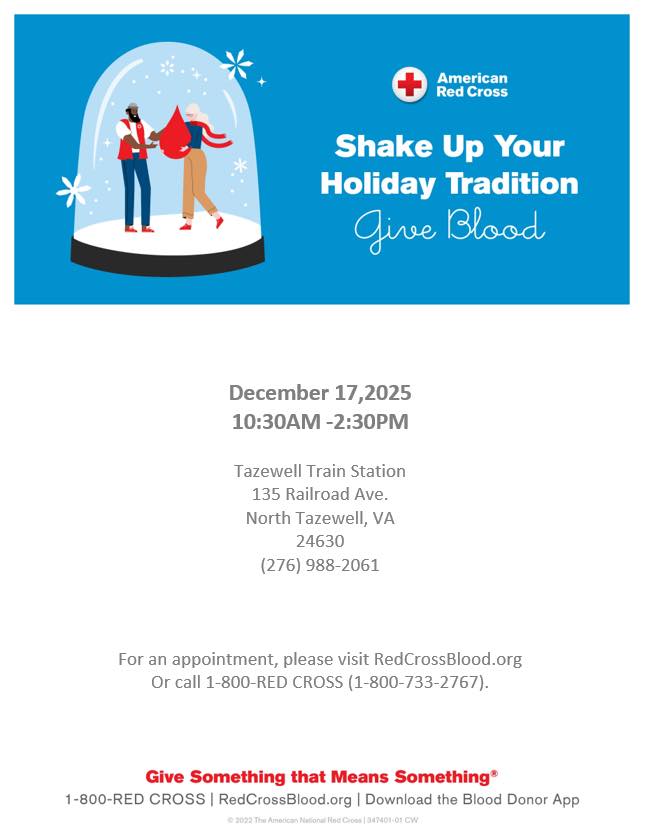 17dec10:30 am2:30 pm10:30 am - 2:30 pm Blood DriveTazewell Train Station & Visitors Center, 135 Railroad Avenue
