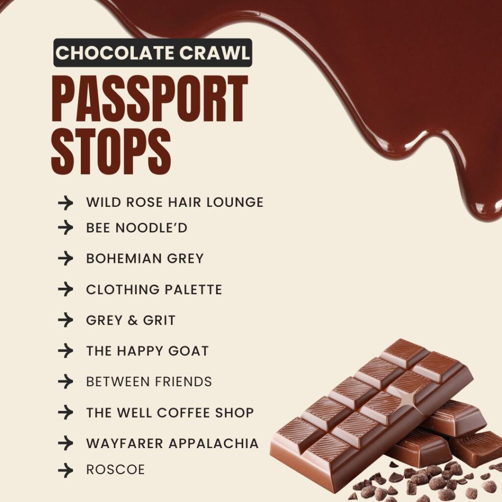 To enjoy the delicious chocolate offerings at each passport stop and be entered into the giveaways, you’ll need a Chocolate Crawl passport.