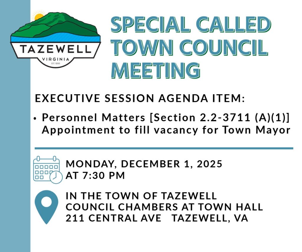 A Special Called Town Council meeting will be held on Monday, December 1, 2025, at 7:30 p.m. in the Town of Tazewell’s Town Council Chambers located at 211 Central Avenue.
