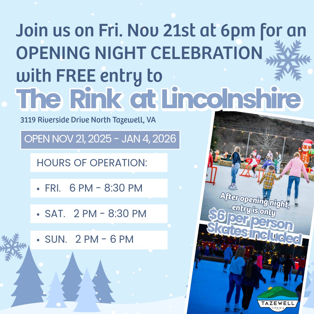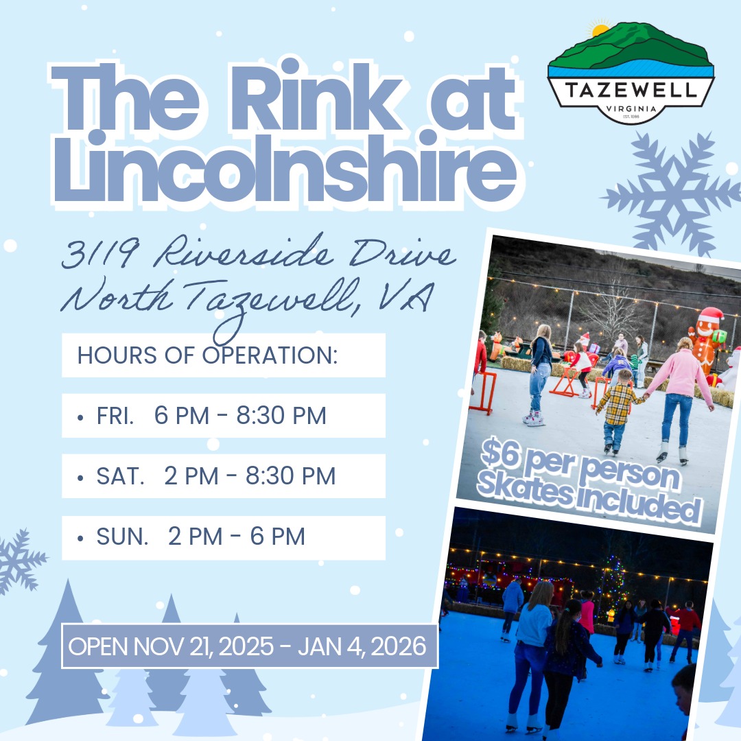 For the 2025 season, The Rink returns to Lincolnshire Park! Operated by the Town of Tazewell’s Recreation Department, The Rink’s synthetic surface offers the ultimate ice-skating experience, without the ice. The entry fee is $6.00 per person, skates included.