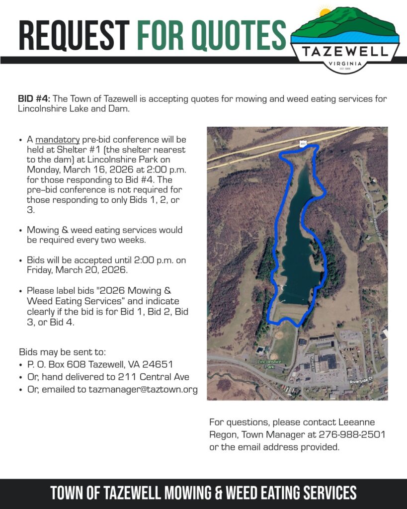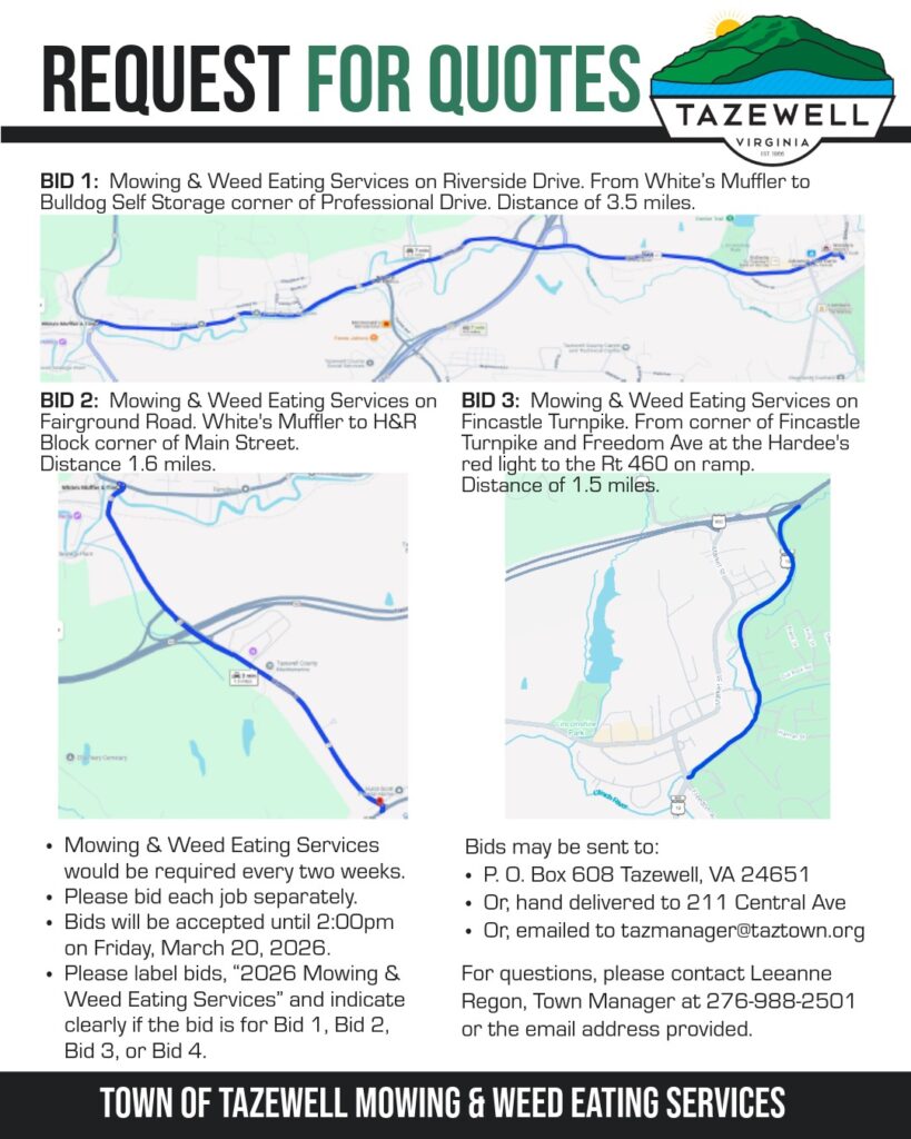 Public Notice: post notice on Town of Tazewell website and in newspaper once a week for two (2) weeks. Public notice must be given a minimum of 10 business days, per Va. Code. Posting to eVA is encouraged.